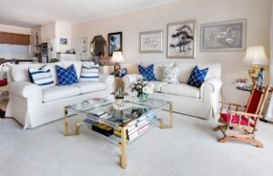 Salon z aneksem kuchennym – połączone obszerną wyspą z wysokimi krzesłami.